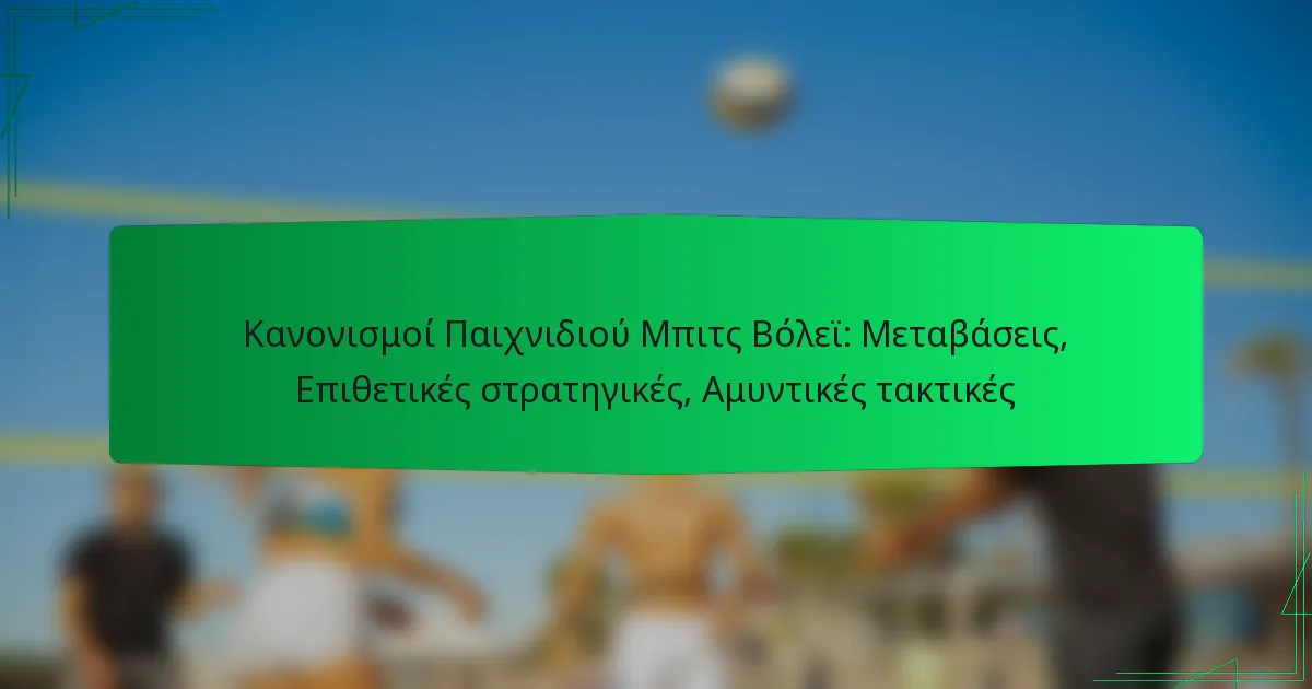 Το μπιτς βόλεϊ διέπεται από συγκεκριμένους κανονισμούς που καθορίζουν τους ρόλους των παικτών, τις αλλαγές και τις τακτικές προσαρμογές, καθιστώντας απαραίτητο για τους παίκτες και τους προπονητές να κατανοούν αυτούς τους κανόνες για να βελτιστοποιήσουν την απόδοση. Οι αλλαγές επιτρέπουν στις ομάδες να αντικαθιστούν παίκτες κατά τη διάρκεια ενός αγώνα, ενισχύοντας το παιχνίδι και προσαρμόζοντας τις στρατηγικές ανάλογα με τις ανάγκες. Ο ρόλος κάθε παίκτη είναι ζωτικής σημασίας, περιλαμβάνοντας ευθύνες όπως το σερβίρισμα, η πάσα, το σπριντ και η άμυνα, όλα τα οποία συμβάλλουν στην επιτυχία της ομάδας.