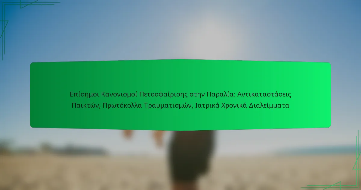 Στο βόλεϊ παραλίας, η κατανόηση των κανόνων που αφορούν τις αντικαταστάσεις παικτών, τα πρωτόκολλα τραυματισμών και τις ιατρικές διακοπές είναι απαραίτητη για την εξασφάλιση δίκαιης παιχνιδιού και ασφάλειας των παικτών. Οι αντικαταστάσεις ρυθμίζονται για να διατηρείται η ακεραιότητα του παιχνιδιού, ενώ τα καθορισμένα πρωτόκολλα αντιμετωπίζουν τους τραυματισμούς και παρέχουν κατευθυντήριες γραμμές για τις ιατρικές διακοπές. Αυτοί οι κανόνες βοηθούν στη διευκόλυνση ενός ομαλού και ανταγωνιστικού περιβάλλοντος αγώνα.
